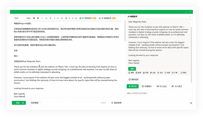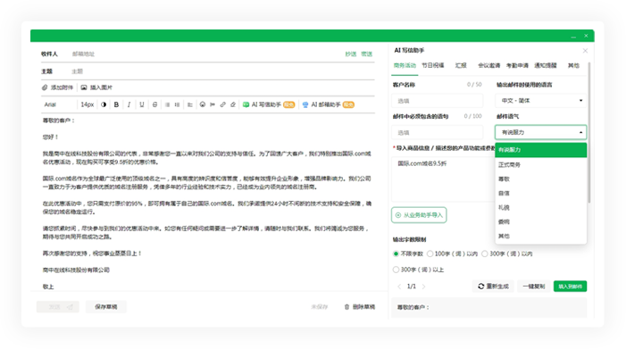 一款专为工作人士设计的智能邮件助手。依托360安全底座与智脑强大能力,为您缔造安全稳定、智能便捷的邮件新体验。深度嵌入了360智脑,让您轻松根据模板生成邮件,根据需求自动生成各种类型的邮件。其邮件分类、主题皮肤、响应式设计和多语言支持,无论是办公邮件还是业务邮件,都能助您轻松撰写,快速响应,沟通无国界,从而提升工作效率与业务增长。