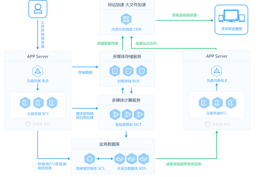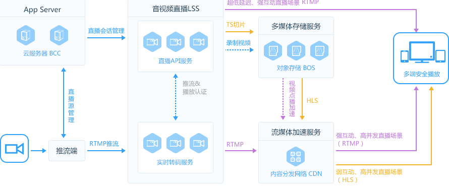 百度智能云视频点播基于大规模实时流媒体计算集群和强大的音视频信号处理算法,结合CDN技术服务深度开发优化,提供"清晰流畅、低时延、高并发"的音视频直播服务。